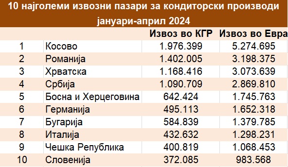 Македонските кондиторски производи се продавале на 56 пазари во регионот и светот. Само на девет пазари е остварен извоз поголем од 1 милион евра.