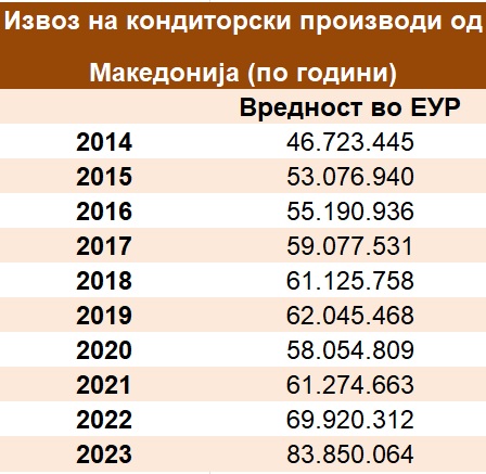 Во текот на изминатата 2023 година од земјава биле извезени кондиторски производи во вредност од 83,9 милиони евра. Во споредба со пред десет години извозот на кондиторски е поголем за 80%.