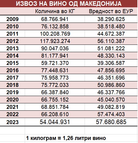 Количински извозот на вино лани бил намален за 18%. Но, ако се анализираат податоците во последните 15 години, извезените количини на вино лани се најмали во последните 20 години.