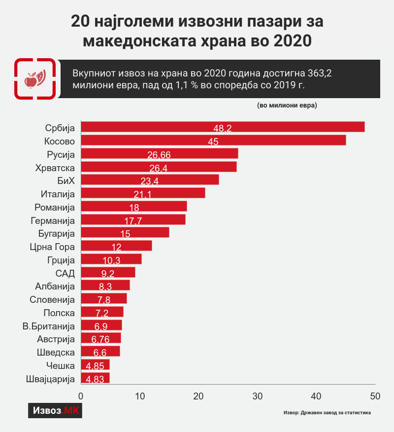 Романија е седми најголем пазар за извоз на македонската храна и прехранабени производи, каде минатата 2020 година е остварен извоз од 18 милиони евра.