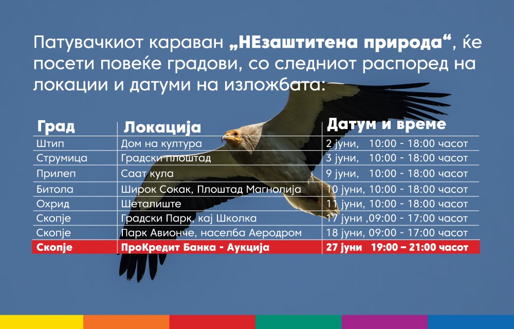 Изложбата „НЕзаштитена природа“ ќе се одвива во текот на три викенди, опфаќајќи шест градови низ целата држава, почнувајќи од 2 јуни до 18 јуни. Овој настан има за цел да ја подигне свеста за важноста за зачувувањето на незаштитените природни подрачја значајни за птиците и за биодиверзитетот.