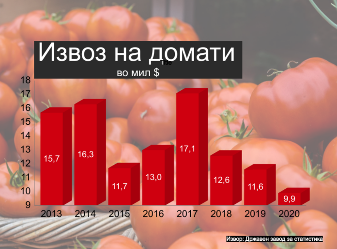 Извозот на домати од Македонија минатата 2020 година е намален за 14,6% во споредба со претходната година и достигна вредност од 9,9 милиони долари. Т Статстичките податоци покажуваат дека извозот на македонски домати минатата година бил најмал во последите осум години.
