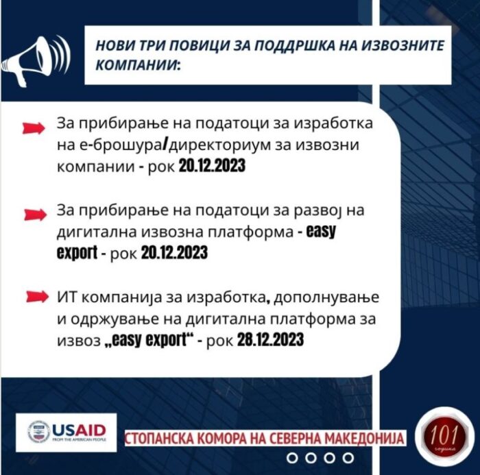 ✅ За прибирање на податоци за развој на дигитална извозна платформа – easy export – рок 20.12.2023