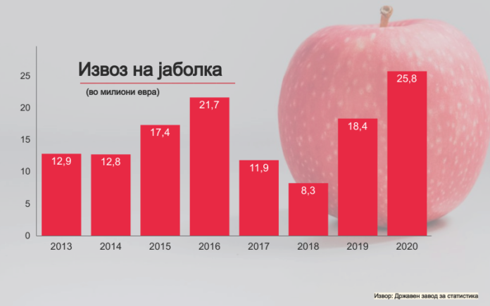 Во текот на изминатата 2020 година од Македонија биле извезени јаболка во вредност од 25,8 милиони евра, што е зголемување за 40,4% или за 7,4 милиони во споредба со претходната 2019 година, покажуваат податоците од државниот завод за статистика.