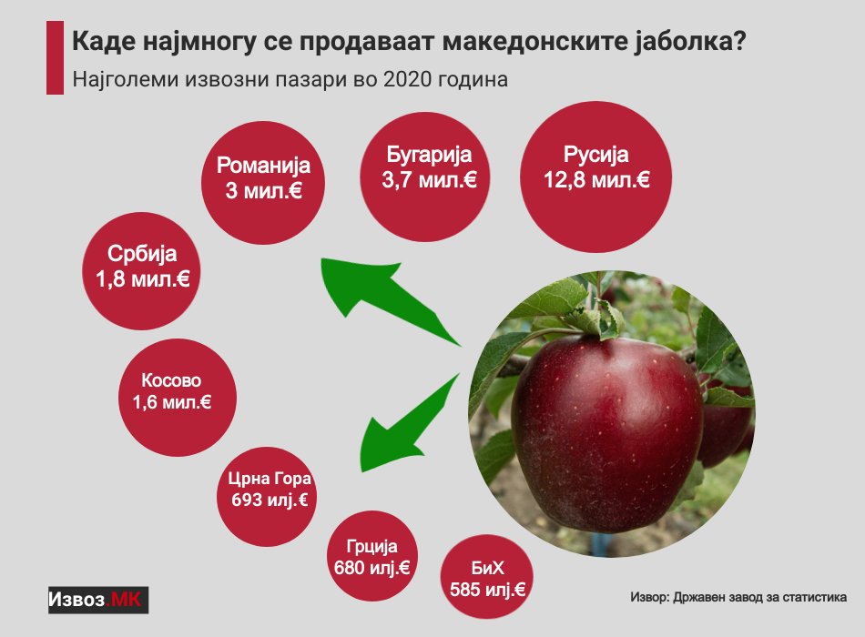 Следат Србија со извоз од 1,8 милиони евра и Косово каде лани биле извезени јаболка во вредност од 1,6 милиони евра