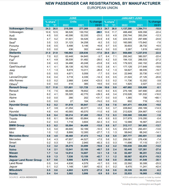 Досега оваа година, регистрациите на нови автомобили паднаа за 14% на 4,6 милиони возила, во споредба со првите шест месеци од 2021 година.