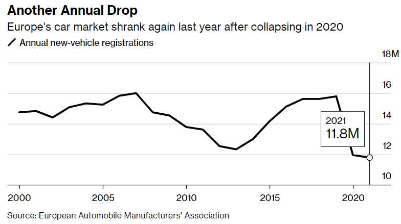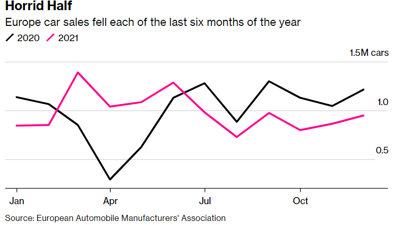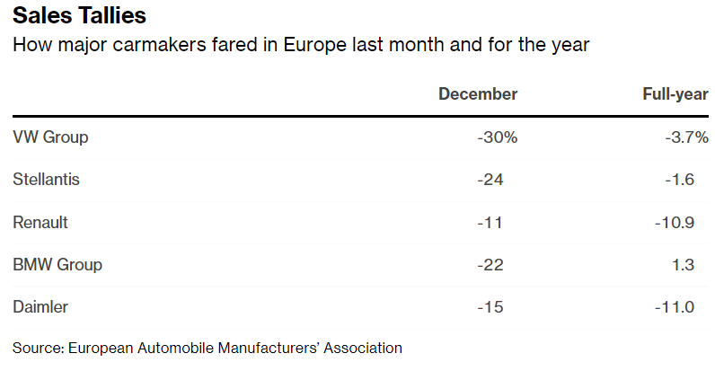 Германија, најголемиот европски пазар на автомобили, го предводеше падот со пад од 27% во декември, со што домот на BMW AG и Volkswagen AG стана единствената голема земја која забележа годишен пад. Повторната пандемија ја принуди германската влада повторно да воведе низа ограничувања, а најголемата економија на континентот се намали за дури 1% во текот на последниот квартал од годината.