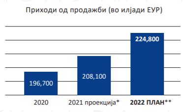 Според единечниот биланс на успех, во периодот јануари – декември 2021 година продажбите достигнуваат 9.559.754.748 денари (155,4 милиони евра), што е за 4 % повеќе во споредба со истиот период од минатата година.