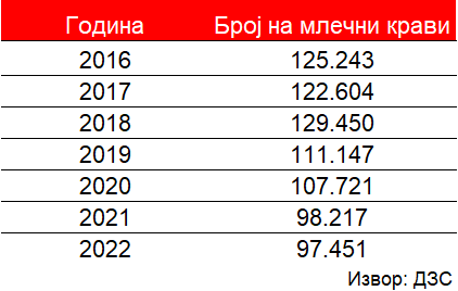 Податоците од Државниот завод за статистика покажуваат дека лани во Македонија имало 97.451 млечна крава, а нивниот број секоја година се намалува. За споредба со 2016 година во земјава имало 125.243 млечни крави, што е околу 30 илјади помалку од пред шест години или намалување за 22%.