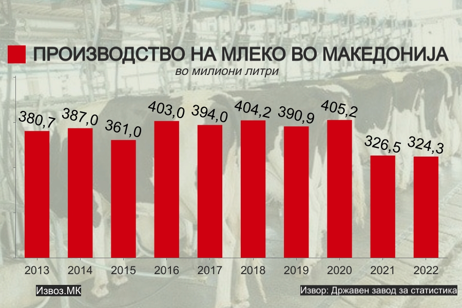 Податоците покажуваат дека минатата година во Македонија биле произведени 324,3 милиони литри млеко, што е најниска количина на млеко произведена во земјава во последните 10 години.