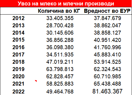 Податоците од Државниот завод за статистика покажуваат дека минатата 2022 година во Македонија биле увезени млеко и млечни производи во вредност од 81,5 милиони евра, што е раст од близу 25% за само една година. Големиот раст на увозот лани пред се се должи на високиот раст на цените со оглед дека увезените количини се намалени. Што значи дека за помали количини сме морале да плаќаме повеќе.
