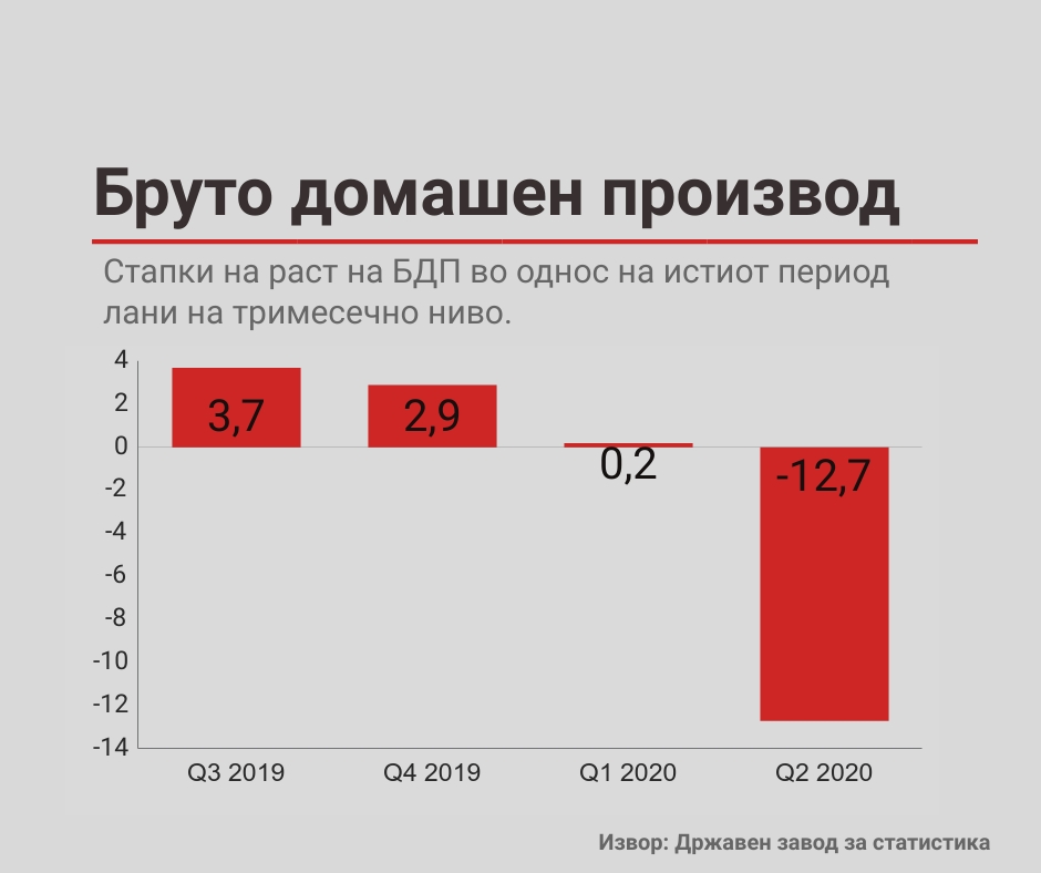 Затворањето на економијата и мерките преземени за ограничување на движењата резултираа со најголем досега пад во македонската економија. Македонскиот Бруто домашен производ (БДП) во вториот квартал забележа пад од 12,7% во споредба со истиот период лани, што е рекордно најголем пад на БДП, покажуваат денеска објавените податоци на Државниот завод за статистика.