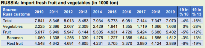 Русија во 2019 година увезла 5,5 милиони тони овошје, што е за 5% помалку во споредба со 2018 година, но за 12% помалку во споредба со увезените колични на овошје во 2013 година.