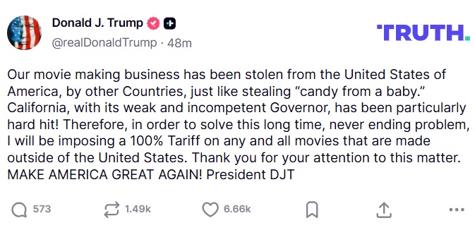 Соединетите Американски Држави ќе воведат 100% царина за сите филмови произведени во странство, изјави претседателот Доналд Трамп во понеделник во објава на Truth Social.