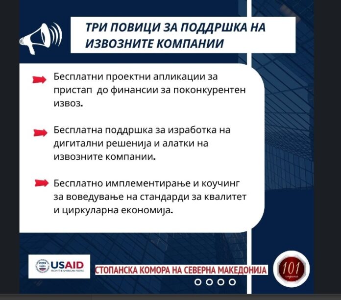 Стопанската комора на С.Македонија во рамките на проектот за Поддршка на приватниот сектор за регионална интеграција (Private Sector Regional Integration Support Activity) поддржан од Агенцијата за меѓународен развој на САД (УСАИД) денеска објави три повици за поддршка на извозните компании, за консултантски куќи и консултанти: