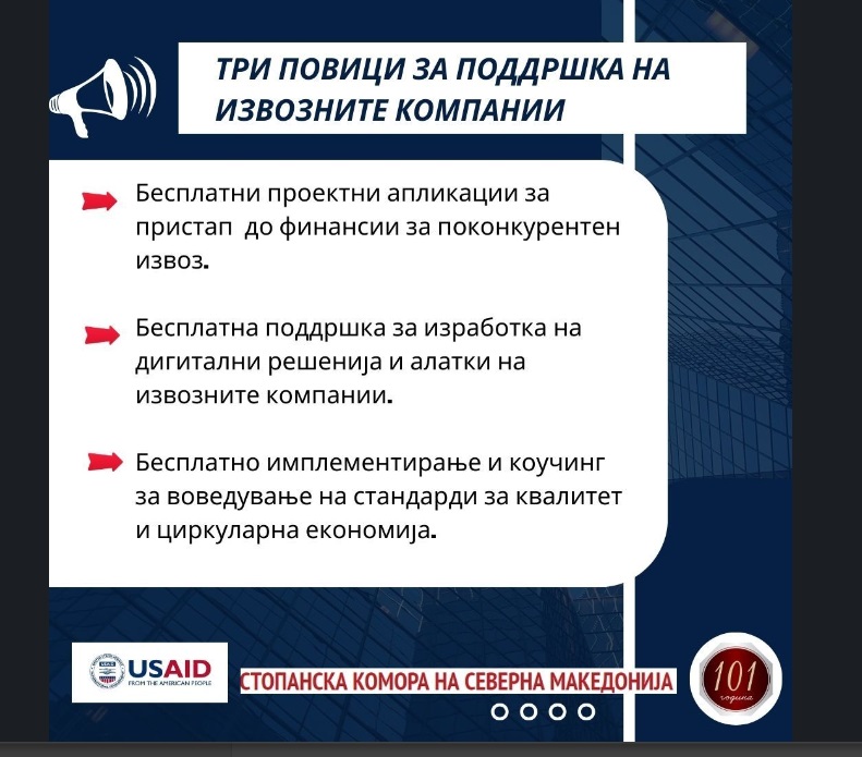 ·       Бесплатна поддршка за изработка на дигитални решенија и алатки на извозните компании.