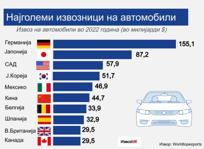 Овие пет земји оствариле повеќе од половина (51,4%) од извозот на автомобили во 2022 година.