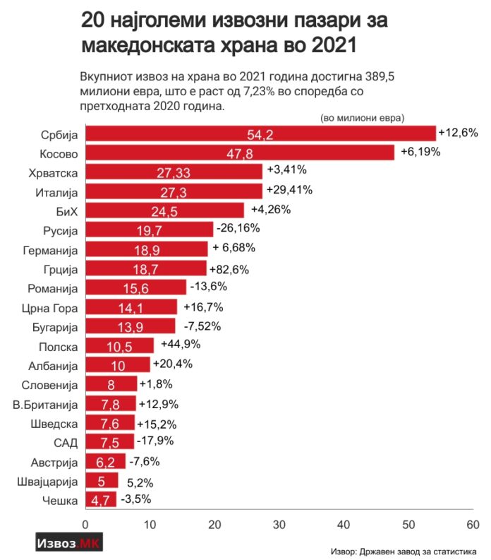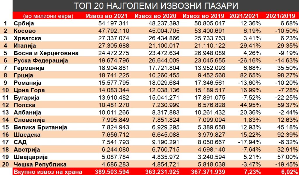 Изминатата година најголем извозен пазар за македонските прехранбени производи остана Србија, каде биле извезени производи вредни 54,2 милиони евра, што е за 12,4% или за шест милиони евра повеќе во споредба со 2020 година. Најголем дел од извозот на храна на српскиот пазар отпаѓа на извозот на ајвар и други преработки од зеленчук и овошје, чиј извоз лани достигна 11,2 милиони евра. Околу 11 милиони евра изнесувал и извозот на зеленчук (најмногу се продавале домати), извозот на овошје изнесувал 9,7 милиони евра (најмногу се продавало свежо грозје). Следат кондиторските производи со продажби вредни 6,7 милиони евра.