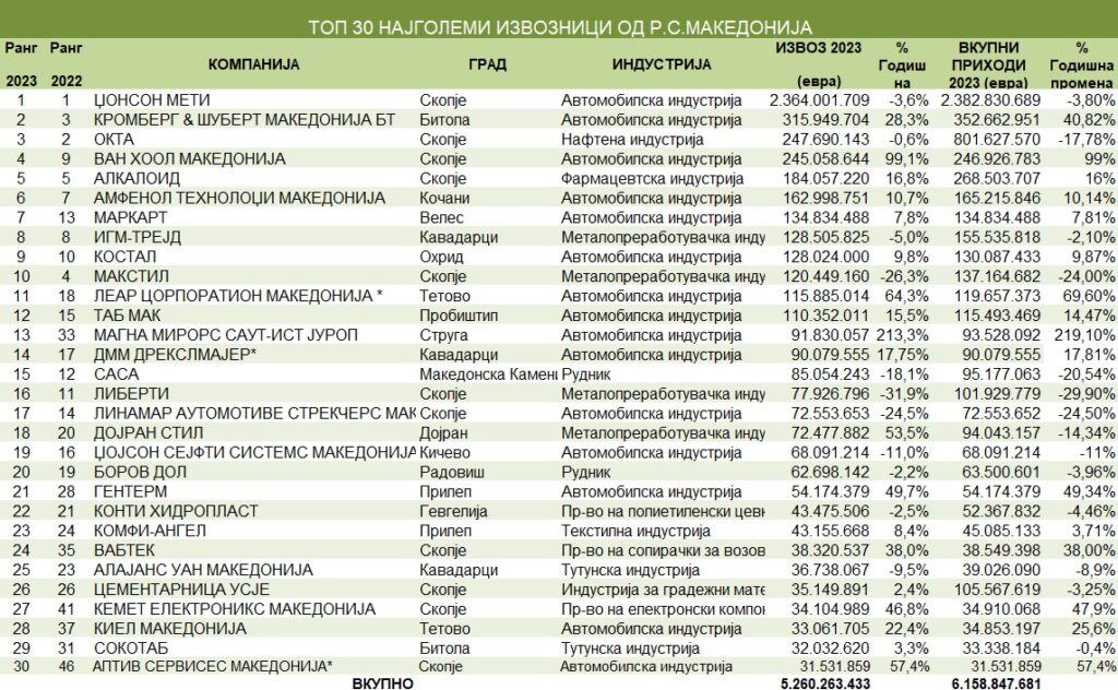 Најголемите 10 извозници лани направиле вкупен извоз од 4 милијарди евра, што е близу 65% од вкупниот извоз на најголемите 100 извозни компании, односно 48% од целиот извоз на стоки од земјата во текот на 2023 година. Од првата десетка, дури шест компании се од автомобилската индустрија. Две компании се од металопреработувачката индустрија. Осум компании од 10-те најголеми извозници се со странски капитал, а само две, Алкалоид и ИГМ Трејд се компании со домашен капитал.