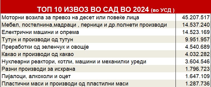 Следат суровиот тутунот од чиј извоз лани се остварени приходи од 9,95 милиони долари, преработките од зеленчук и овошје со извоз од 4,5 милиони долари (најголем дел отпаѓа на ајварот), потоа следуваат чоколади и други производи од какао со извоз од 4 милиони долари, нуклеарни реактори, котли, машини и механички уреди во вредност од 3,6 милиони долари, разни производи за изхрана во вредност од близу 1,8 милиони долари, пијалоци во вредност од 1,65 милиони долари и пластични маси и производи од пластични маси во вредност од 1,3 милиони долари.