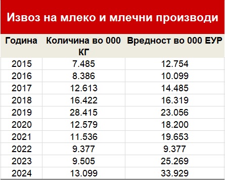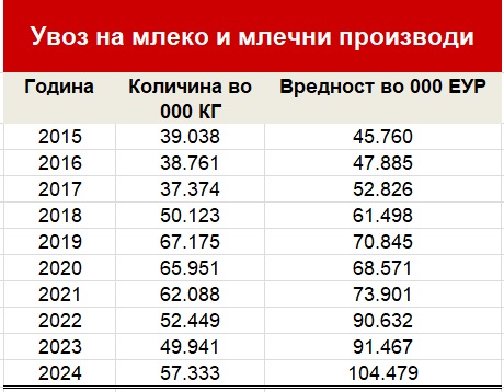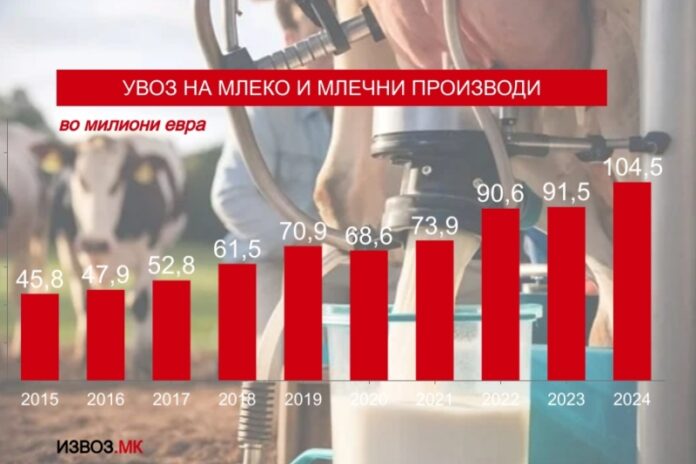 Истата 2024 година увозот на млечни производи во странство надмина рекордни 104 милиони евра, што е историски највисока вредност досега во Македонија. Увезени биле над 57 илјади тони млечни производи, раст од над 14% во споредба со претходната година.