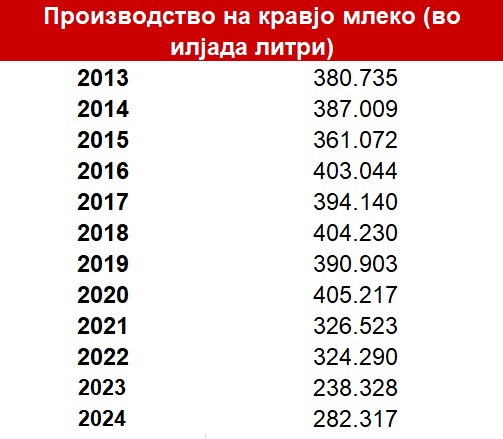 Минатата година биле произведени 282 илјади литри млеко. Иако производството е зголемени во однос на претходната година, во споредба од пред пред десетина година сега се произведуваат речиси 100 илјади литри помалку млеко.