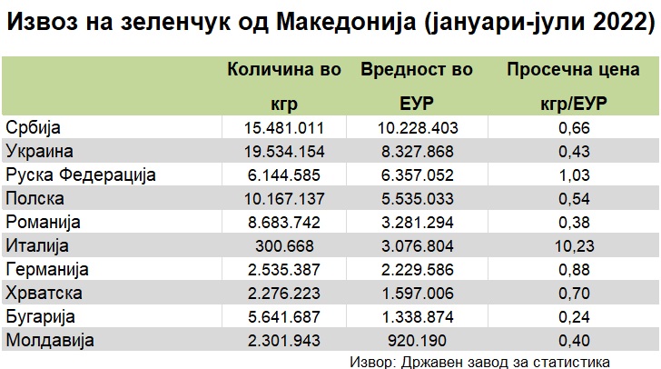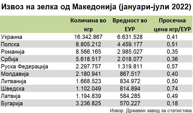 Податоците покажуваат дека од вкупниот извоз на зелка од Македонија во странство, чија вредност во првите седум месеци годинава изнесува 23,8 милиони евра, најголем дел или 6,63 милиони евра биле извоз во Украина.