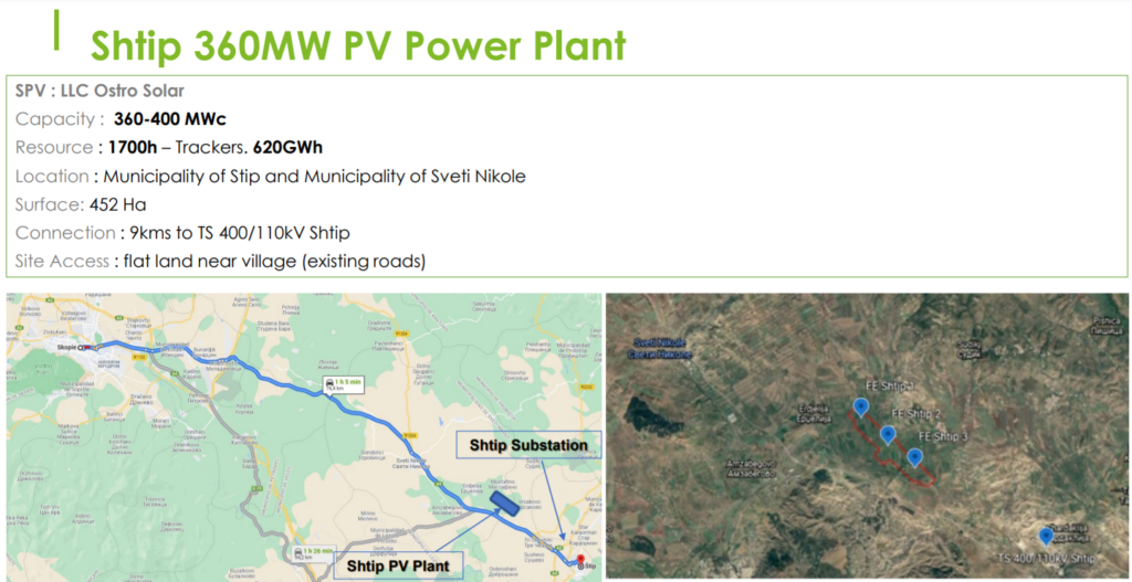 „Северна Македонија ќе добие соларен парк, кој ќе биде еден од најголемите во Европа со капацитет за производство на електрична енергија од 360 до 400 мегавати (MW). Станува збор за директна француска гринфилд инвестиција најголема во овој домен, за македонската економија. Соларниот парк „Стипион“ ќе се гради во текот на 2022 година на локацијата која беше предвидена за изградба на карго аеродромот во Штип на површина од 452 хектари“, рече премиерот Зоран Заев на денешната промоција на инвестицијата во присуство на амбасадорот на Франција Сирил Бомгартнер, како и претставници на менаџментот на француската компанија „Акио Енерџи“.
