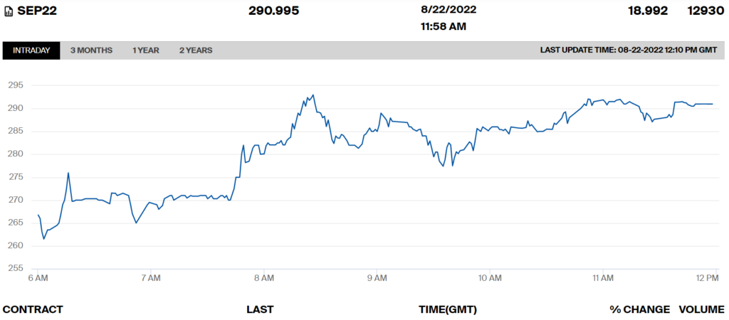 Во фјучерсите на холандската TTF сурова нафта, цената на гасот за испорака во септември скокна на 3.024 долари за 1.000 кубни метри, или 292,4 евра за мегават-час (MWh) по тековниот девизен курс од евро во долар.