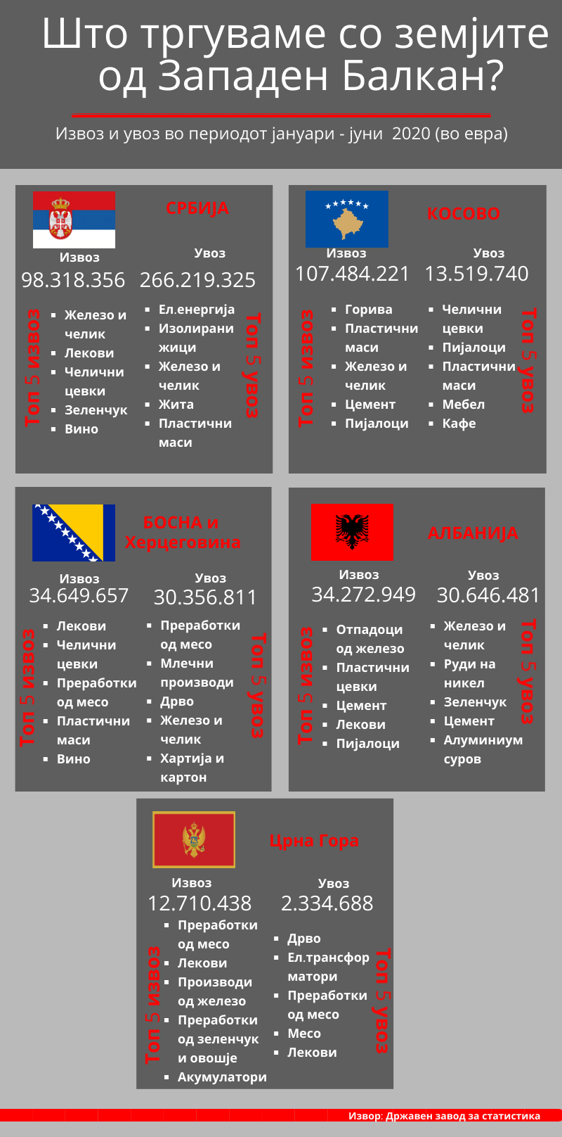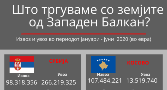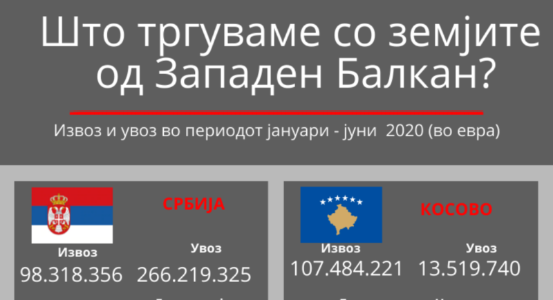 Земјите од Западен Балкан се втор најголем трговски партнер за македонските компании, после Европската унија. Во првата половина од 2020 година во петте земји од Западен Балкан (Србија, Косово, Албанија, БиХ и Црна Гора) македонските компании извезле производи во вредност 287 милиони евра или 11,7% од вкупниот извоз од земјава во овој период.