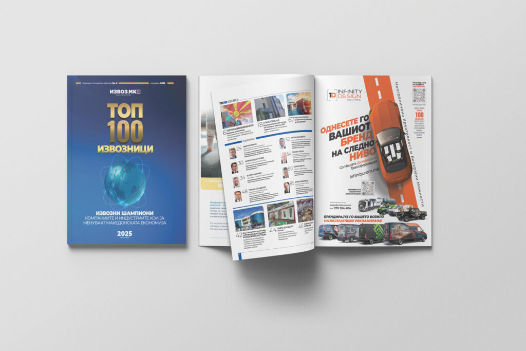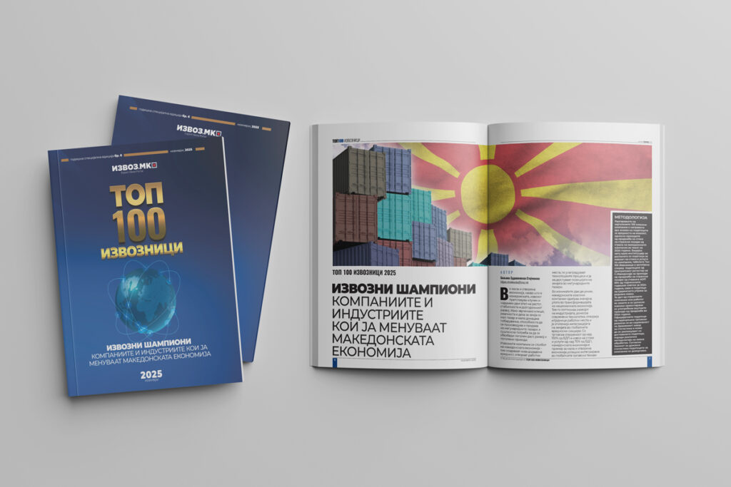 Едицијата „ТОП 100 ИЗВОЗНИЦИ 2025″ излегува шеста година по ред и се објавува во висококвалитетно печатено издание на 92 страни, со аналитички содржини и екслузивни рангирања и прилози. Публикацијата се дистрибуира до најзначајните институции во земјава, бизнис комори, амбасади…