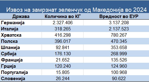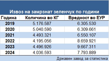 Во текот на 2024 година, од Македонија биле извезени околу 4.000 тони замрзнат зеленчук, во вкупна вредност од 7,8 милиони евра (8,45 милиони долари), покажуваат податоците од Државниот завод за статистика.