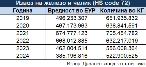 Македонската индустрија за железо и челик бележи континуиран пад на извозот, покажуваат официјалните податоци од Државниот завод за статистика. Во 2024 година, од Македонија биле извезени 523 илјади тони железо и челик, во вредност од 385 милиони евра. Тоа претставува пад од 16,6% во вредност и 6% во количина споредено со претходната година — што упатува на пониски извозни цени како дел од причините.