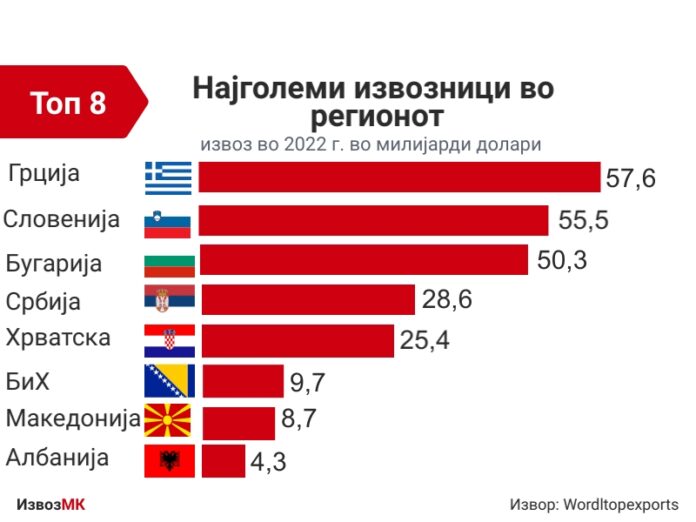 Ако се гледа во регионот, најголеми извозни економии во 2022 година биле Грција, Словенија, Бугарија, Србија, Хрватска, БиХ, Македонија и Албанија.
