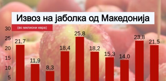 Во текот на 2025 година, на странските пазари биле извезени 65.623 тони јаболка во вкупна вредност од 21,5 милиони евра. Во споредба со 2024 година, количинскиот извоз е намален за значајни 25,2%, додека вредноста на извозот бележи пад од 10%. Сепак, македонските јаболка се продавале по повисоки цени. Просечната извозна цена достигнала 0,327 евра за … Продолжи со читање Лани се извезле помалку јаболка, но по цени највисоки во последната деценија