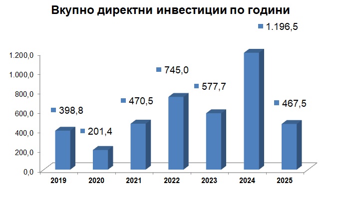 Народната банка објави дека во текот на изминатата 2025 година во македоската економија влегле странски инвестиции од 467,5 милиони евра, што е за 729 милиони евра помалку во споредба со инвестициите во 2024 година, што е годишен пад од 61%.