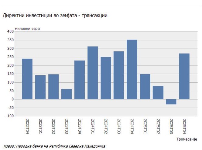 Од Народната банка информираат дека во текот на четвртиот квартал од 2025 година, вкупните директни инвестиции во земјава бележат нето-приливи од 269,9 милиони евра, како резултат на зголемените нето-приливи врз основа на меѓукомпанискиот долг (167,6 милиони евра), сопственичкиот капитал (79,4 милиони евра) и реинвестирањето на добивка (22,9 милиони евра).
